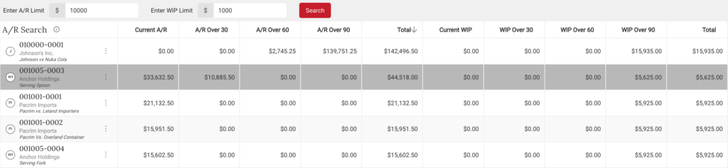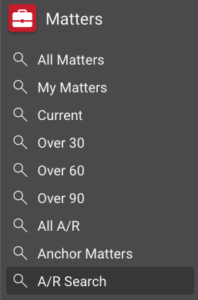 Saved searches are created for attorneys ahead of time so that they can just click on “Over 90” and see all their past due accounts. Pre-built searches can ask questions, e.g. I want to see matters with A/R over $10,000 along with WIP over $1,000.