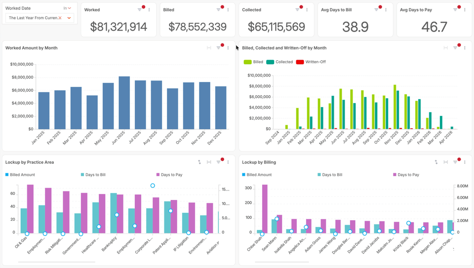 The result is a fundamental blind spot. A strong collections month may simply reflect invoices issued many months prior. A billing spike may mask a growing backlog of aged WIP. Without a throughline connecting work performed → billed → collected, firms end up managing lagging indicators instead of the process that drives them.
