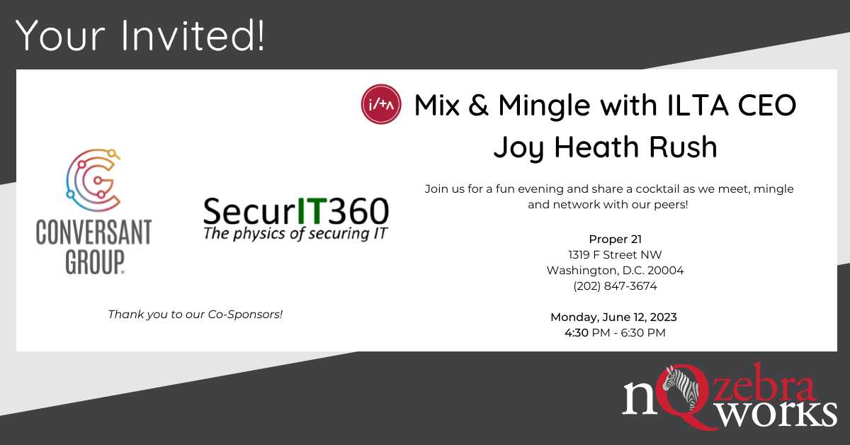 Join us for cocktails and light bites as we mix, mingle, and network with ILTA CEO Joy Heath Rush in Washington, D.C. We are delighted to be co-sponsoring the DC Social with our c0-sponsors SecurIT360 and Conversant Group.